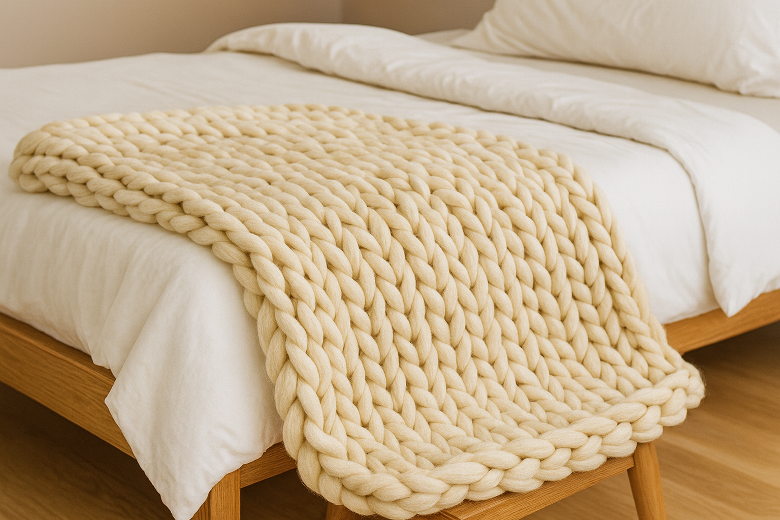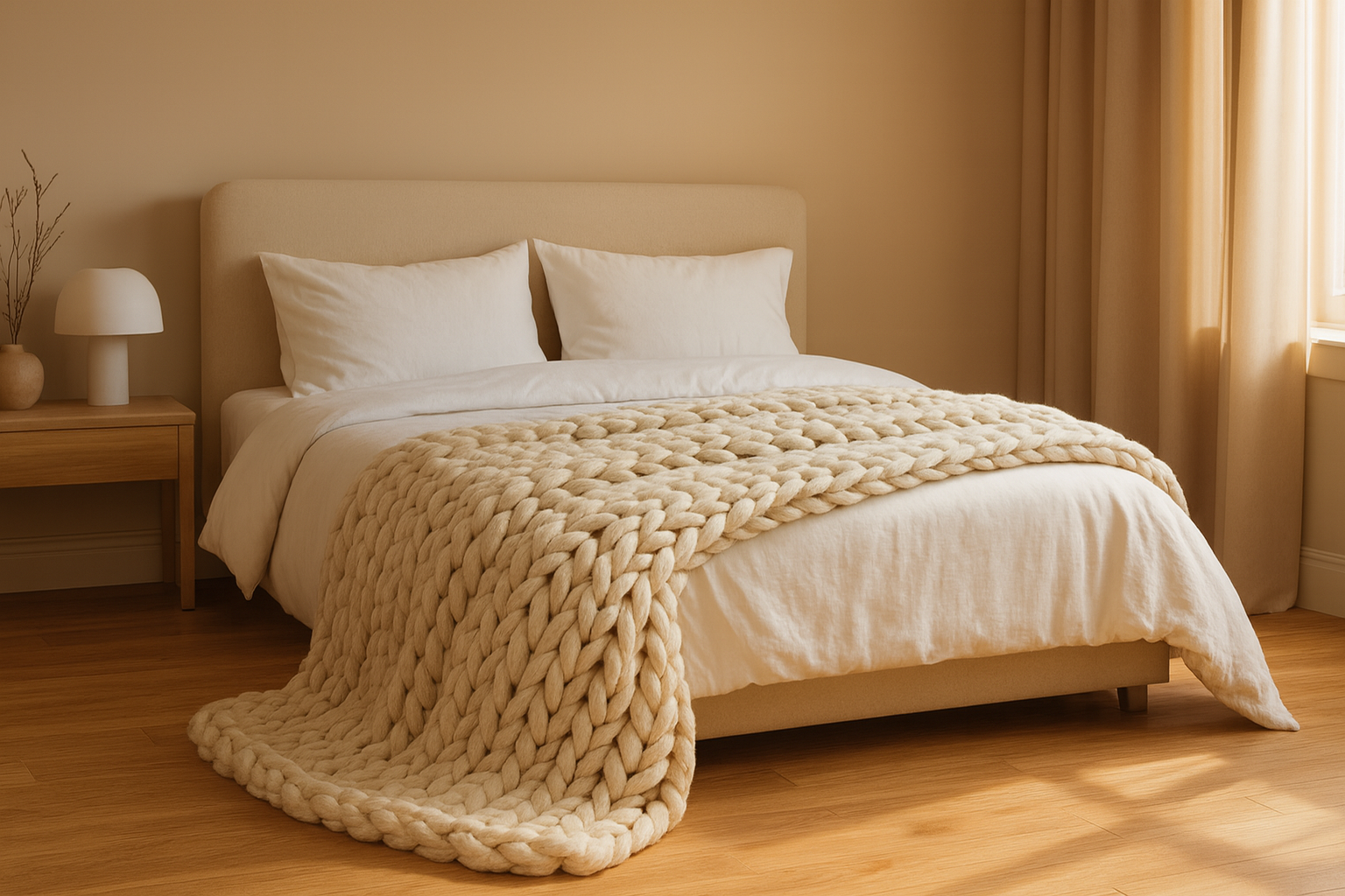 The goal of our brand's founding was to infuse everyday interiors with a sense of softness and tranquility. Chunky-knit blankets create a cozy, welcoming atmosphere in various rooms and blend in well with contemporary decor.