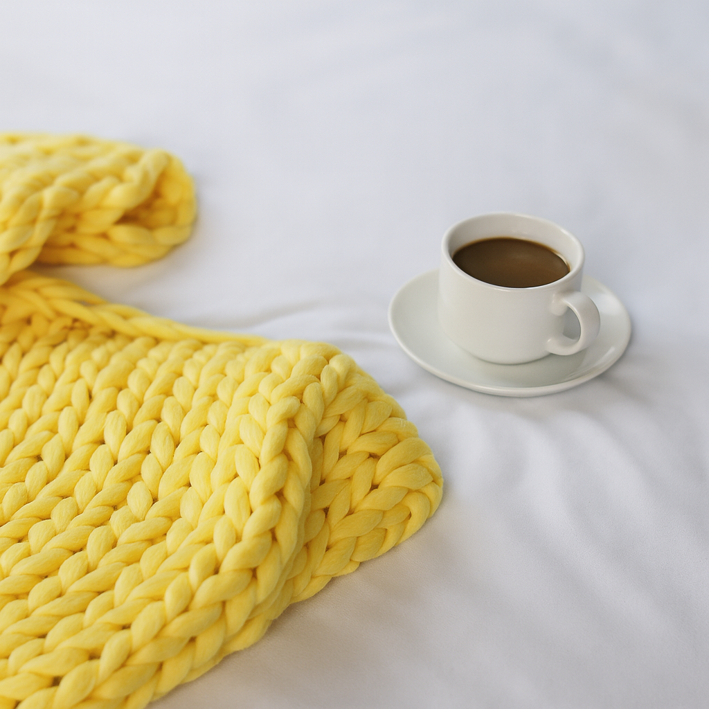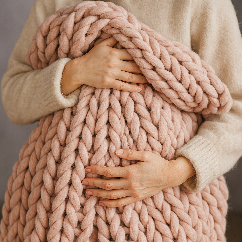 The chunky texture complements various areas of the house and gives the area a subtle warmth. Naturally, the blanket becomes a focal point in the living room, bedroom, or terrace, promoting a serene atmosphere while relaxing on a daily basis. Softness, expressive weaving, and calming color depth are all combined in each piece. This fabric enhances everyday routines and contributes to the creation of a calm environment.